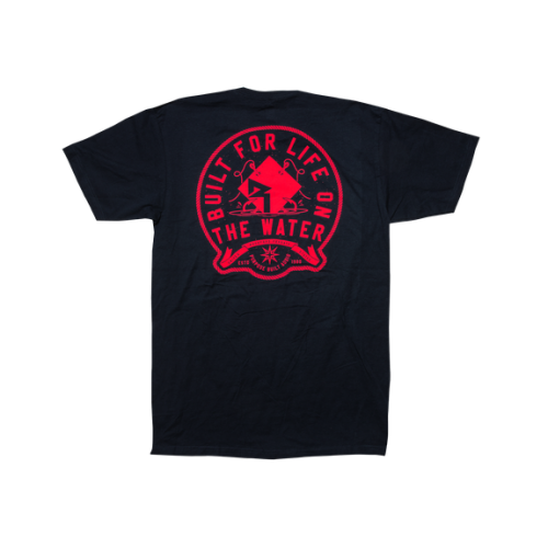 Navy T-shirt with red print front and back. Built for life on the water